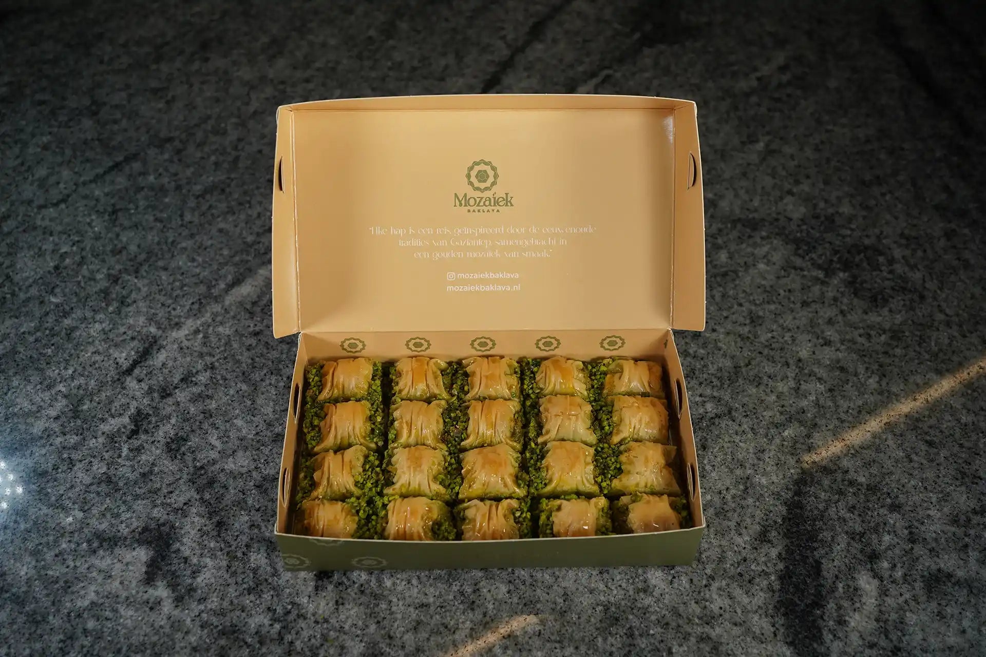 Bestel je vóór 23:59, dan wordt je baklava de volgende werkdag vers gebakken en verzonden. De bezorging gebeurt via PostNL of DHL en duurt meestal 1-2 werkdagen.