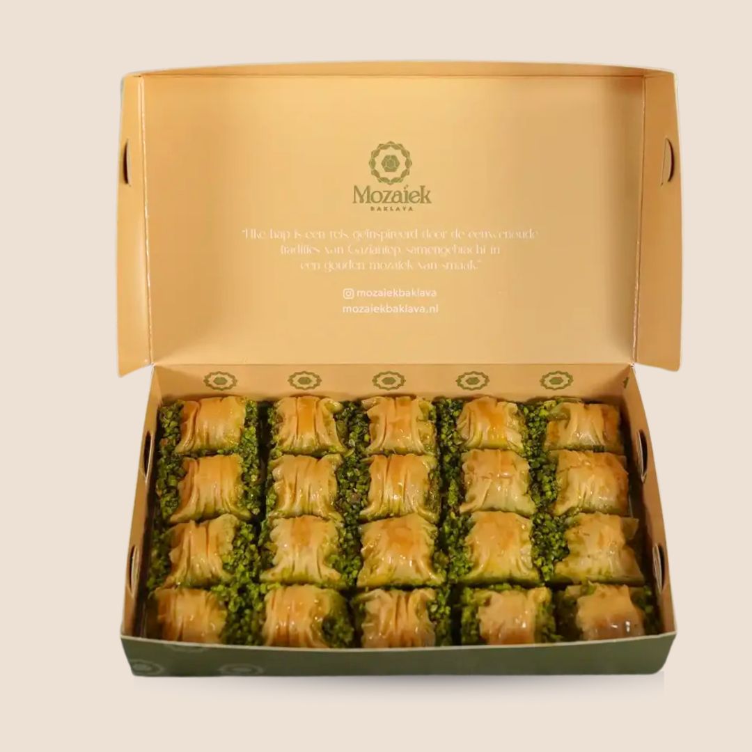Ontdek de verfijnde smaak van onze ambachtelijke Fıstıklı Çimdik, een unieke baklava-variant met een royale pistachevulling. Dunne laagjes filodeeg, zorgvuldig met de hand gevormd en rijkelijk gevuld met premium gemalen pistachenoten, zorgen voor een heerlijke combinatie van knapperigheid en smeuïgheid. Doordrenkt met pure roomboter en afgewerkt met een delicate huisgemaakte siroop voor de perfecte balans tussen zoet en krokant.