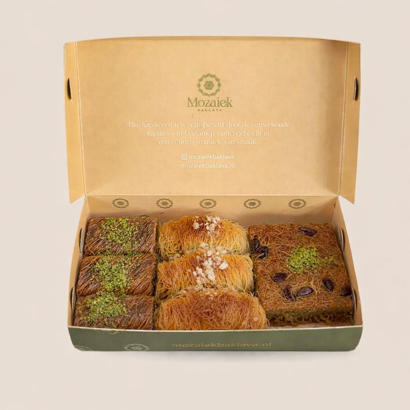 Deze luxe selectie bestaat uit een zorgvuldig samengestelde mix van burma kadayif, top kadayif en baskma kadayif. Elk stuk wordt met de hand bereid volgens traditioneel recept, met een perfecte balans tussen knapperige textuur en rijke vulling.