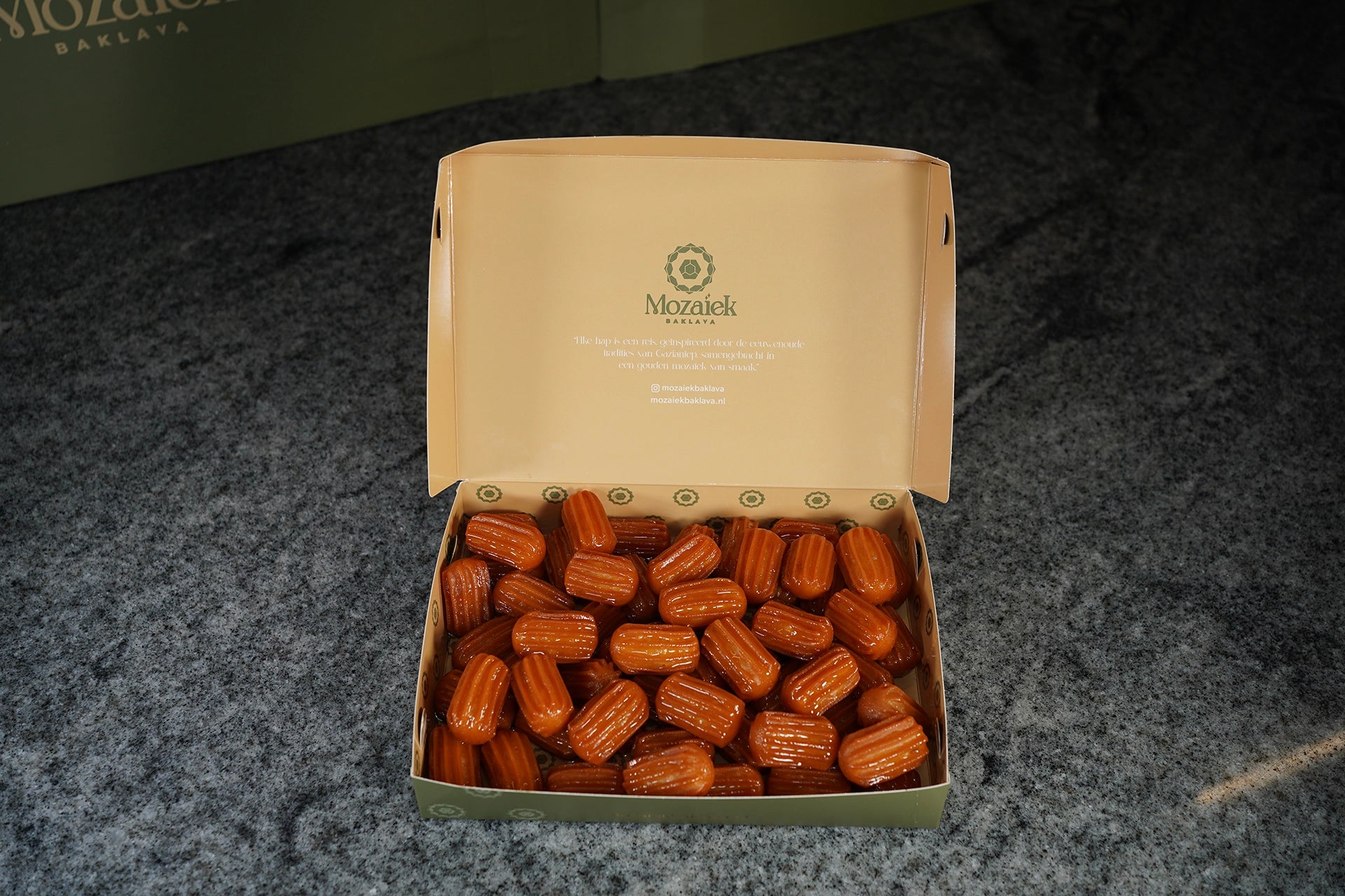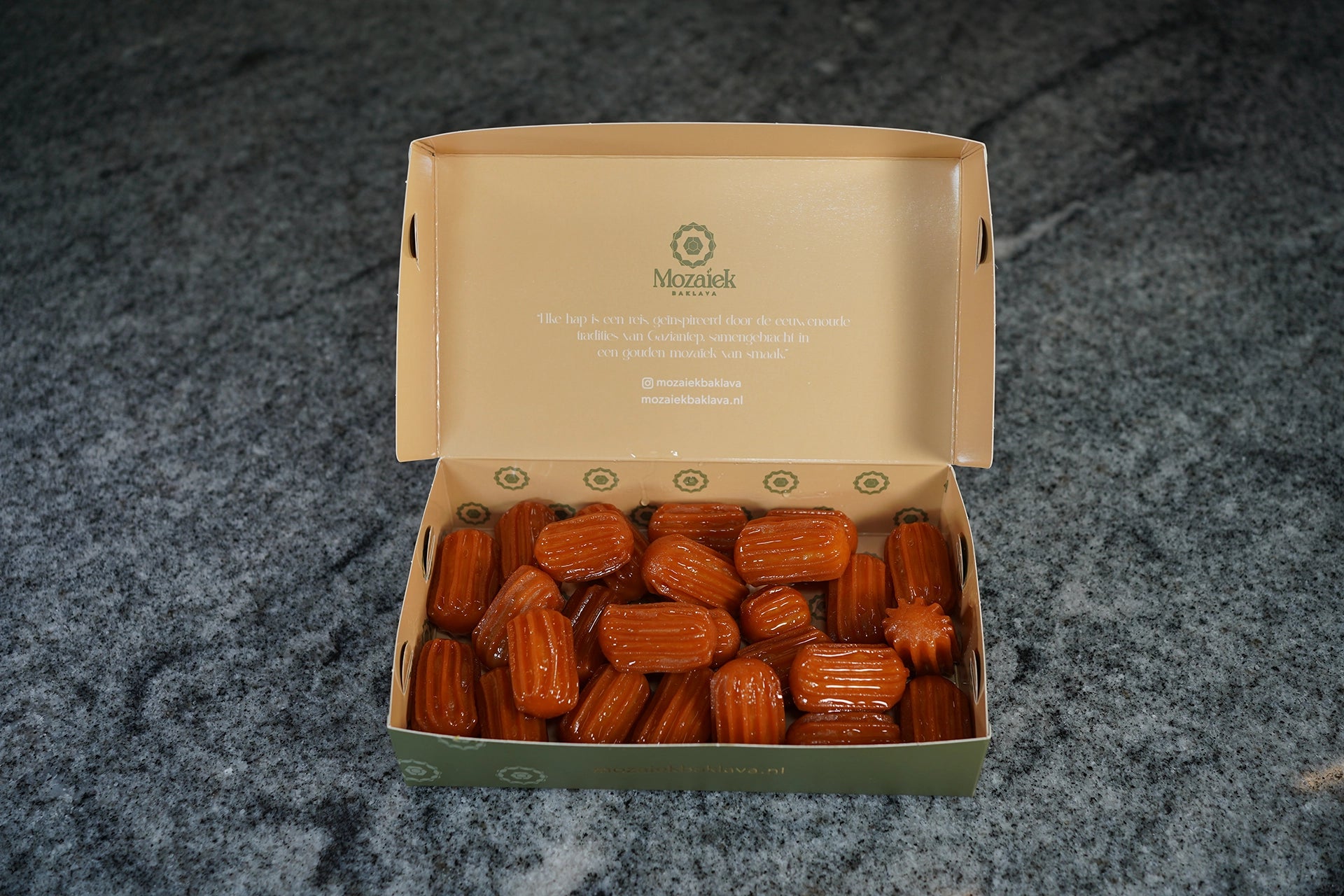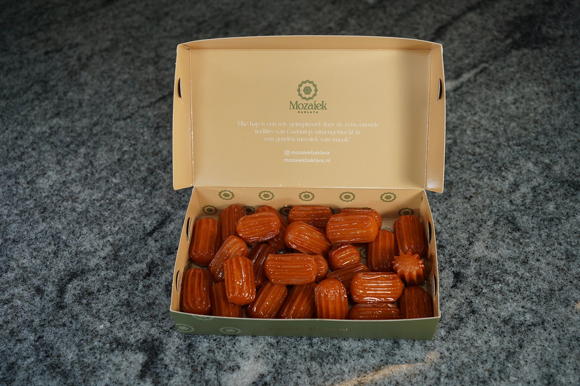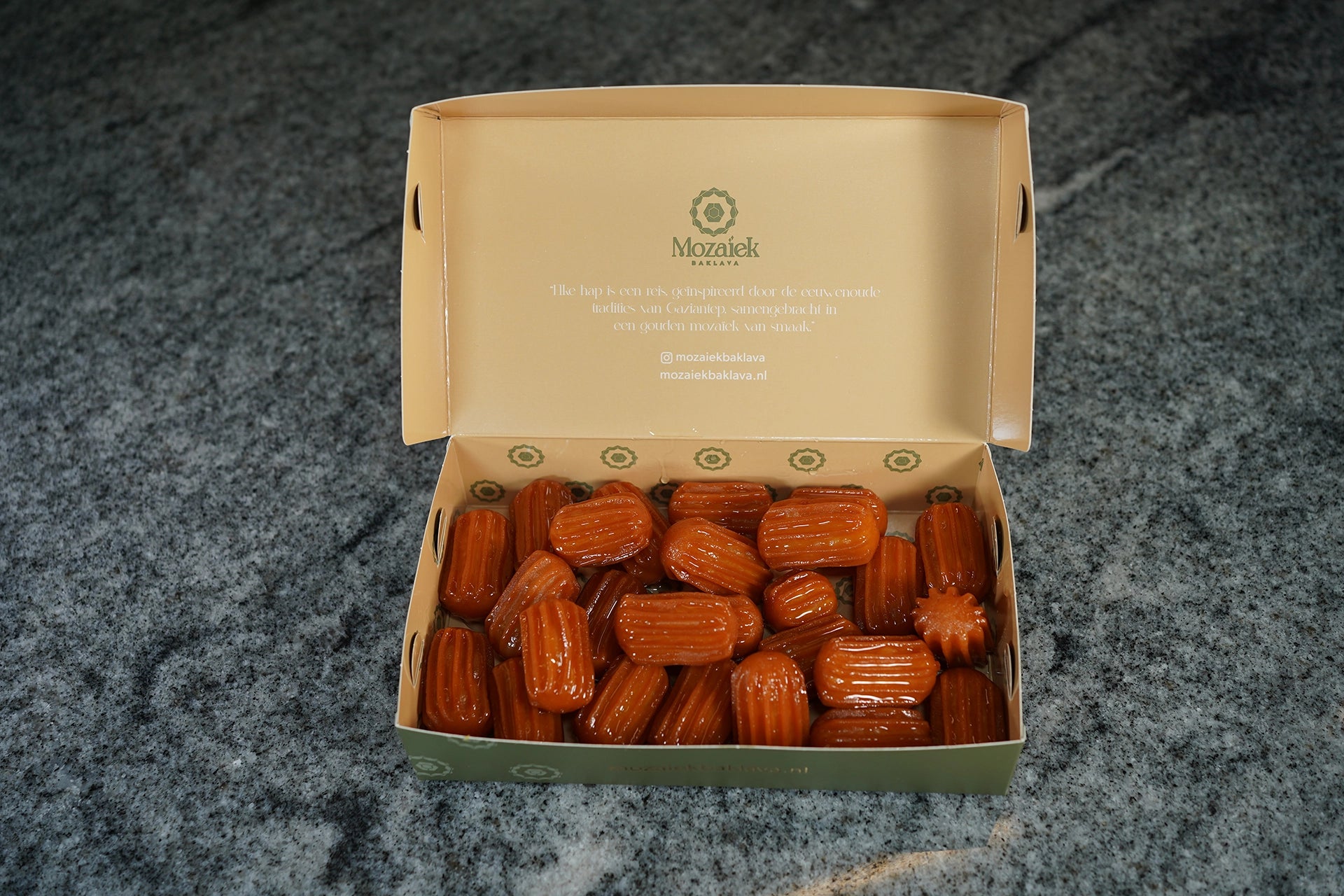 Bestel je vóór 23:59, dan wordt je baklava de volgende werkdag vers gebakken en verzonden. De bezorging gebeurt via PostNL of DHL en duurt meestal 1-2 werkdagen.