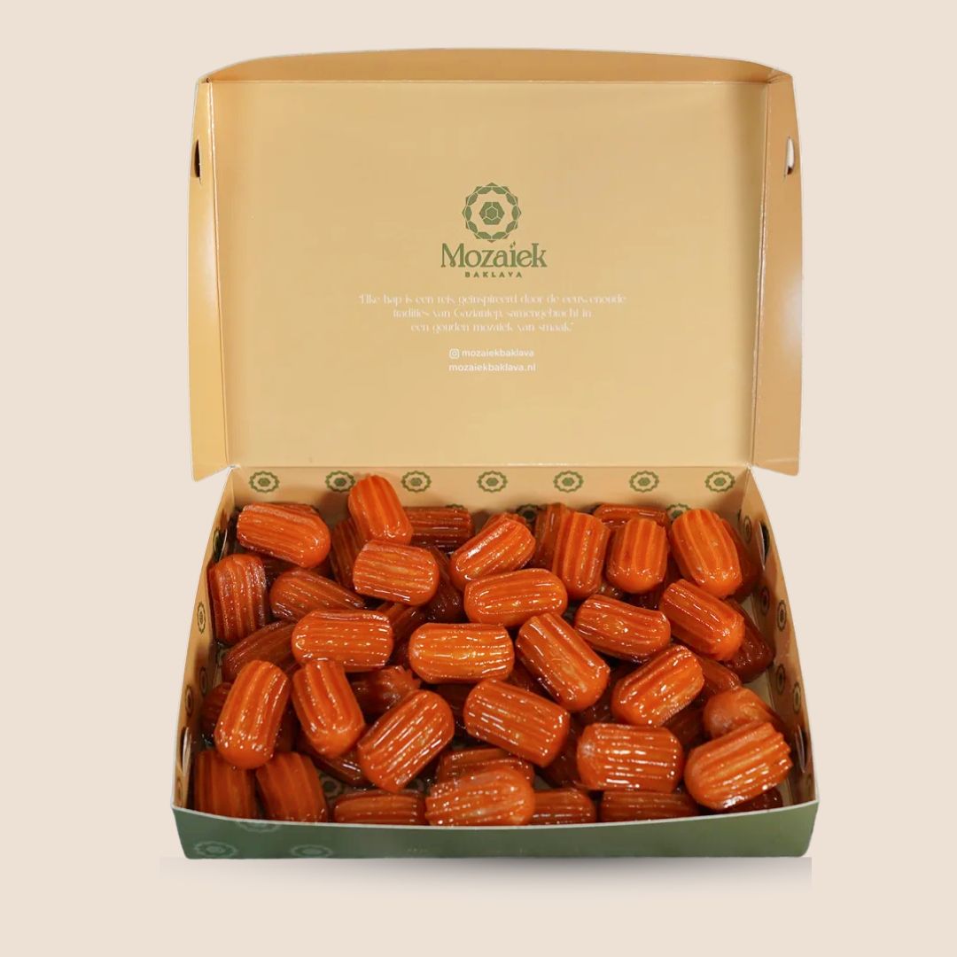 Geniet van de onweerstaanbare smaak van onze ambachtelijke Tulumba, een klassieker uit de Turkse en Balkankeuken. Deze goudbruine, knapperige deegstaafjes worden vers gebakken en direct ondergedompeld in een lichte huisgemaakte suikersiroop, waardoor ze van binnen heerlijk zacht en sappig blijven. Perfect als zoete traktatie bij thee of koffie, en gegarandeerd een favoriet voor liefhebbers van traditionele zoetigheden!
